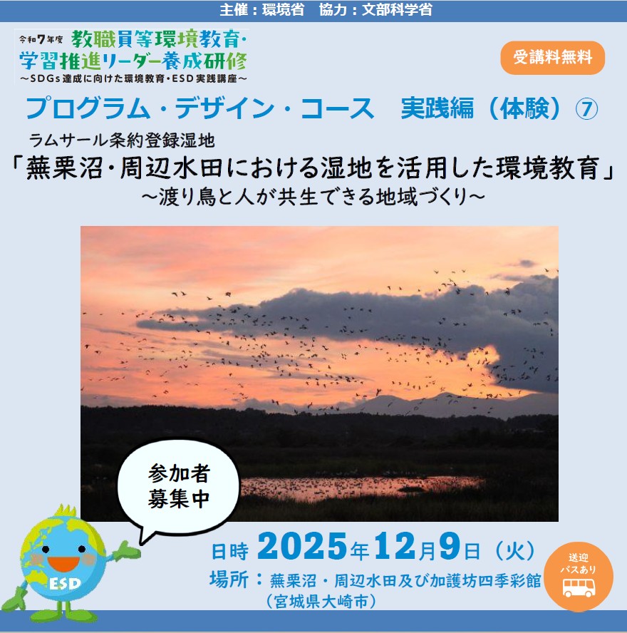 この研修会では、宮城県大崎市・登米市・栗原市に所在するラムサール条約登録湿地である蕪栗沼において「湿地を活用した環境教育」をテーマにしたプログラムを通し、地域と連携した湿地の環境保全や生物多様性の保全のための教育について学んでいきます。